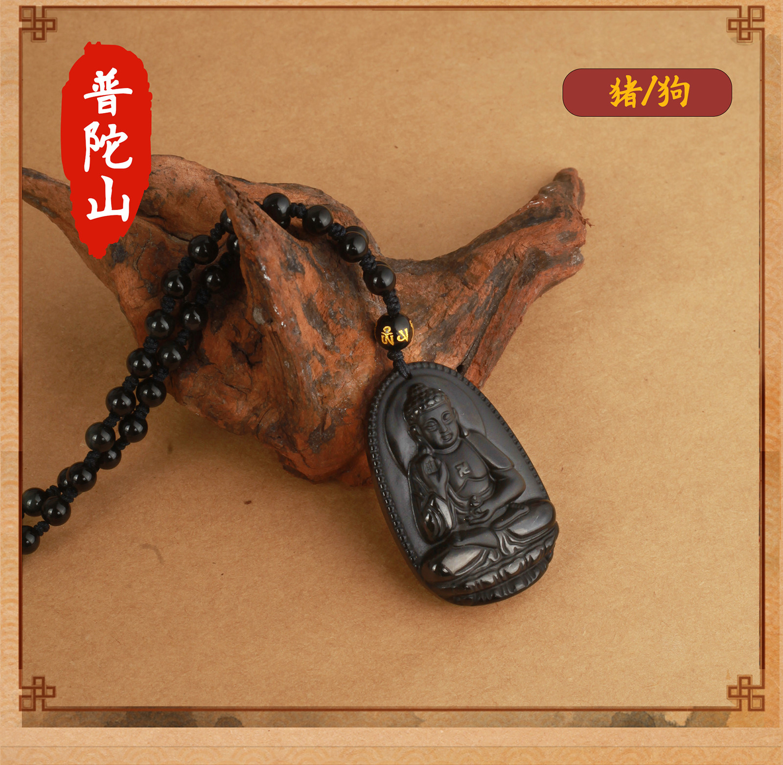 天然黑曜石【狗、猪】阿弥【吊绳款】