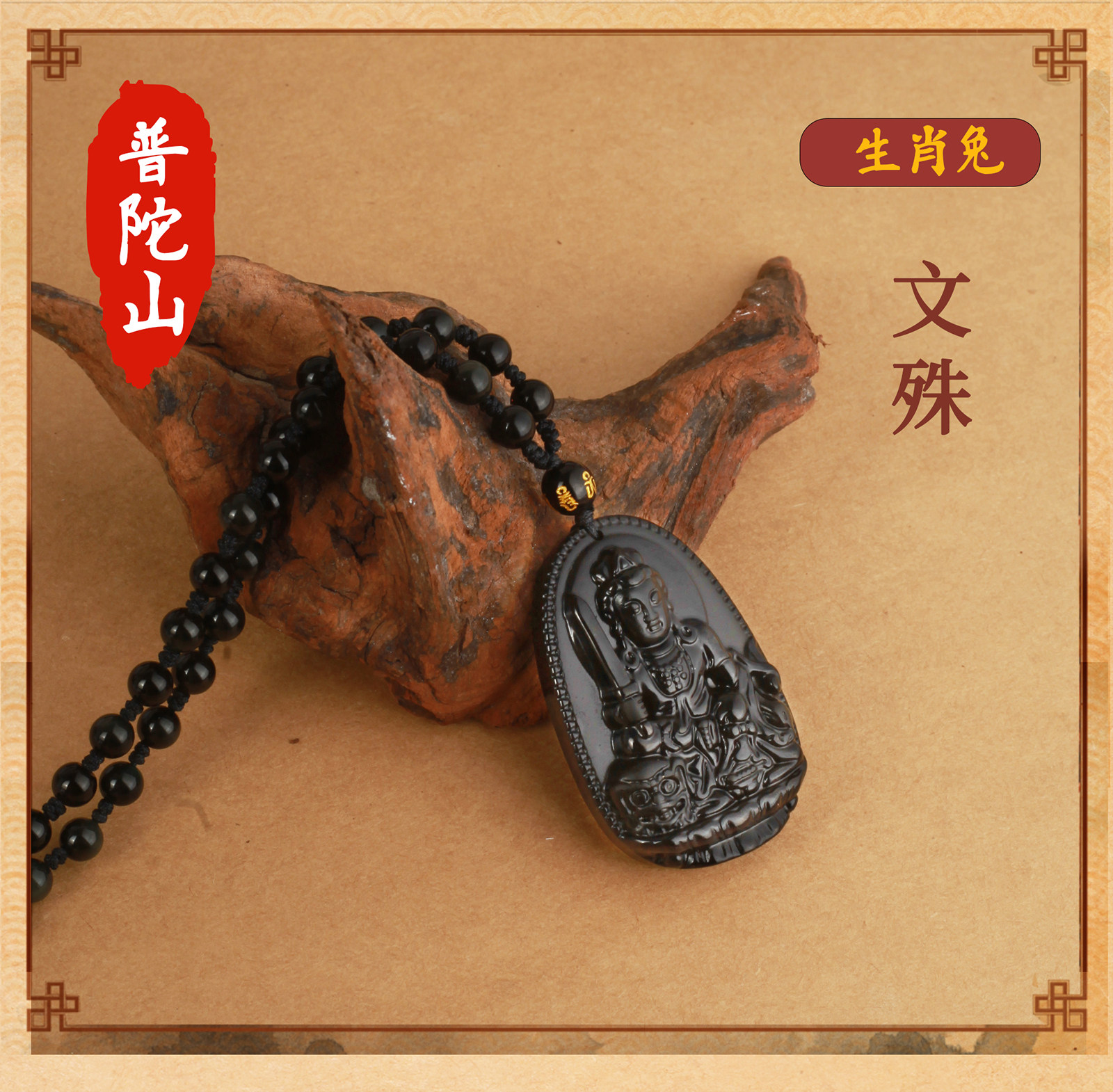 天然黑曜石【兔】文殊菩薩【吊繩款】