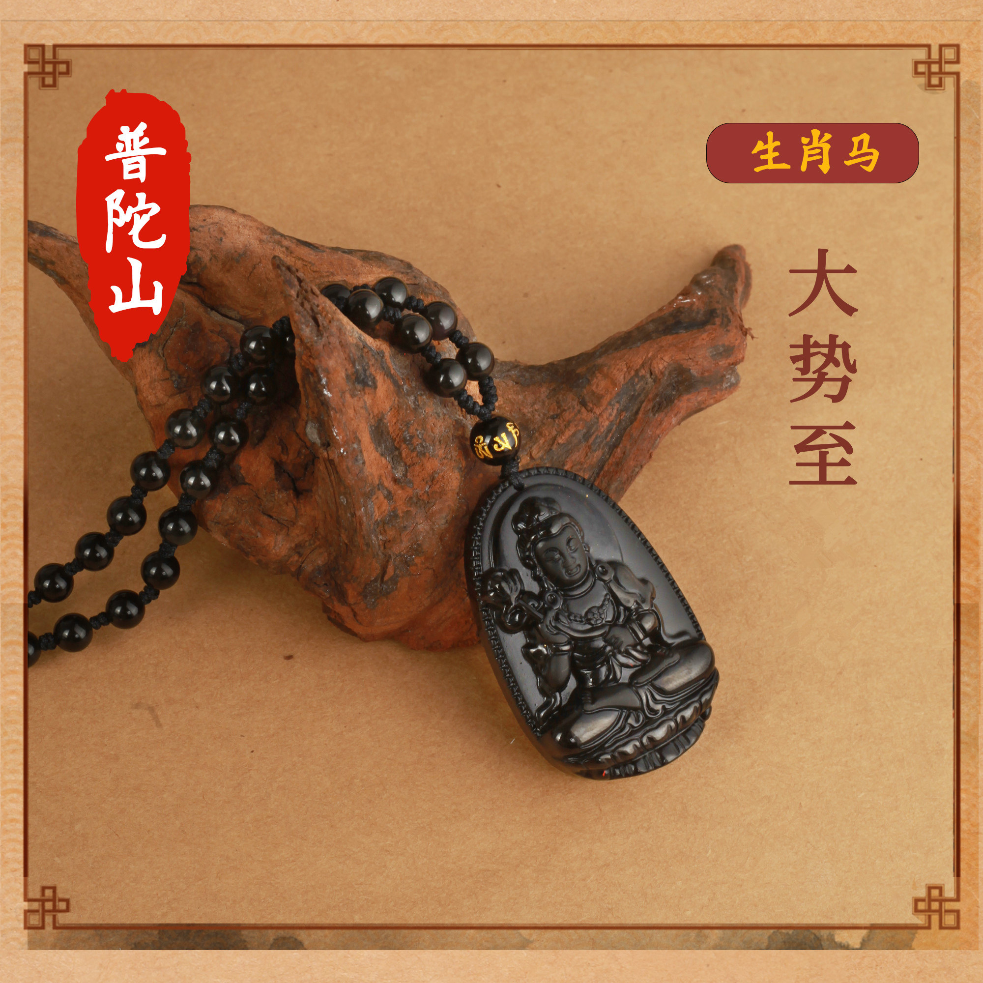 天然黑曜石【馬】大勢至菩薩【吊繩款】